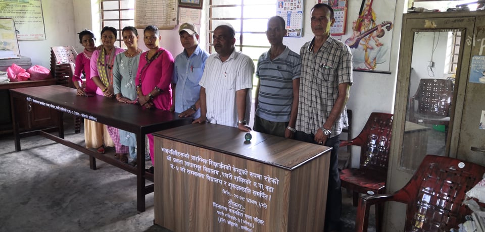 विद्यालयको प्रशासनिक कार्यकक्षलाई दुइ वटा टेबल र १५ वटा कुर्सी हस्तान्तरण गरेको संचारकर्मी भूमिप्रसाद पाठकले बताए ।