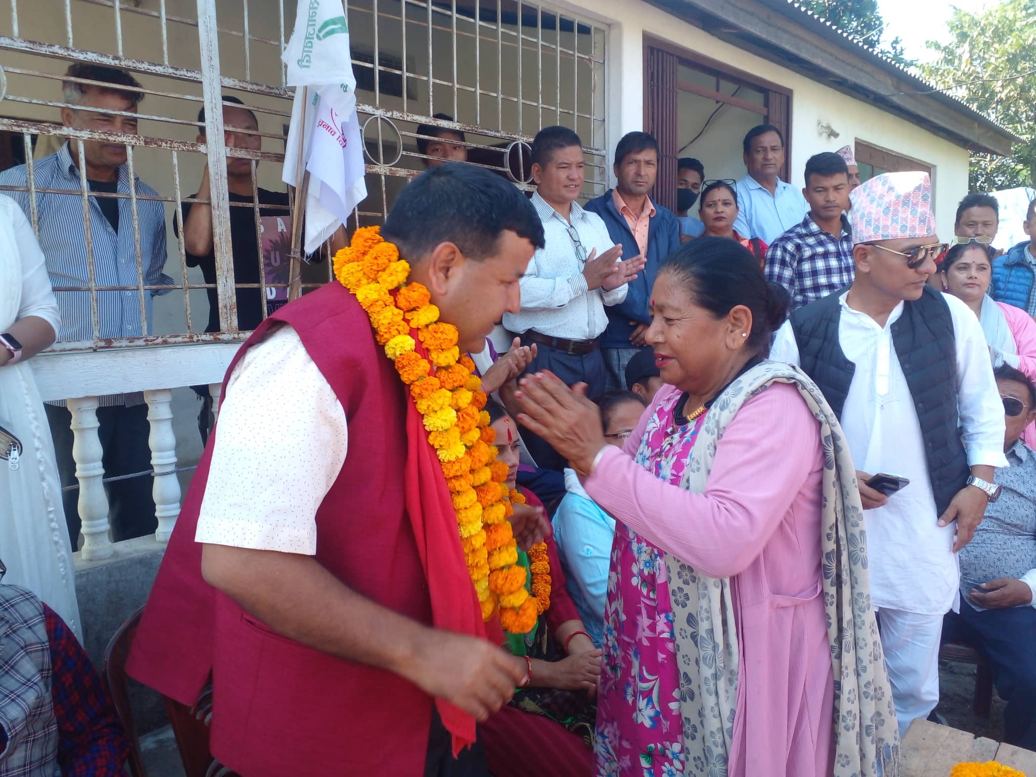 गोपाल जैराई लगायतको स्थानिय मतदाताहरुले गठबन्धनका साझा उम्मेद्धवारहरु शर्मा सहित माओबादी केन्द्रको समानुपातिक उम्मेद्धवार गिता तिम्सीना, नेकपा एसको समानुपातिक उम्मेद्धवार कृष्णकुमारी बिक मानप्रसाद लिम्बु लगायतलाई सयपत्री फुलको माला लगाएर स्वागत तथा सम्मान गरेको हो ।