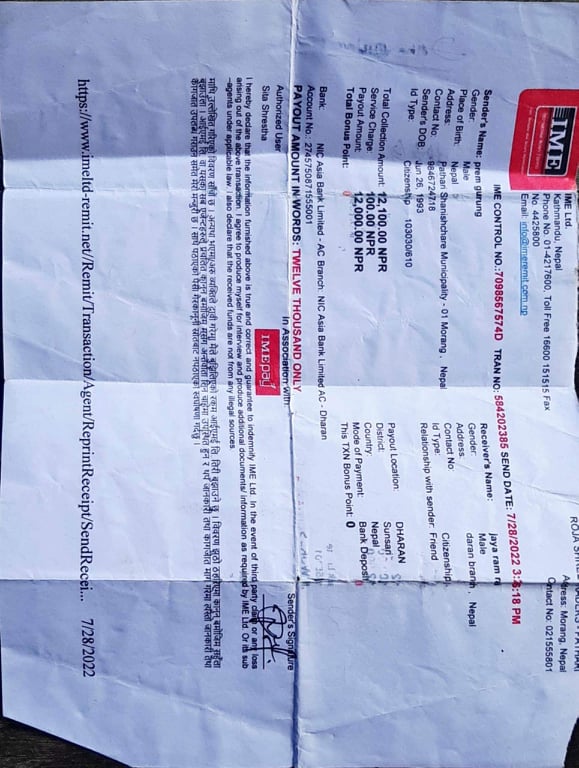 राईलाई आइएमइ गरि पठाएको पैसाको प्रमाण ।