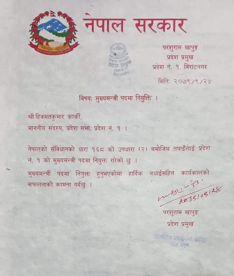 वर्ष ५८ कार्कीलाई प्रदेश प्रमुख खापुङले संविधानको धारा १६८ को उपधारा ९२० बमोजिम बहुमत प्रदेशसभा सदस्यको समर्थनमा मुख्यमन्त्री पदमा नियुत्त गरेका थिए ।