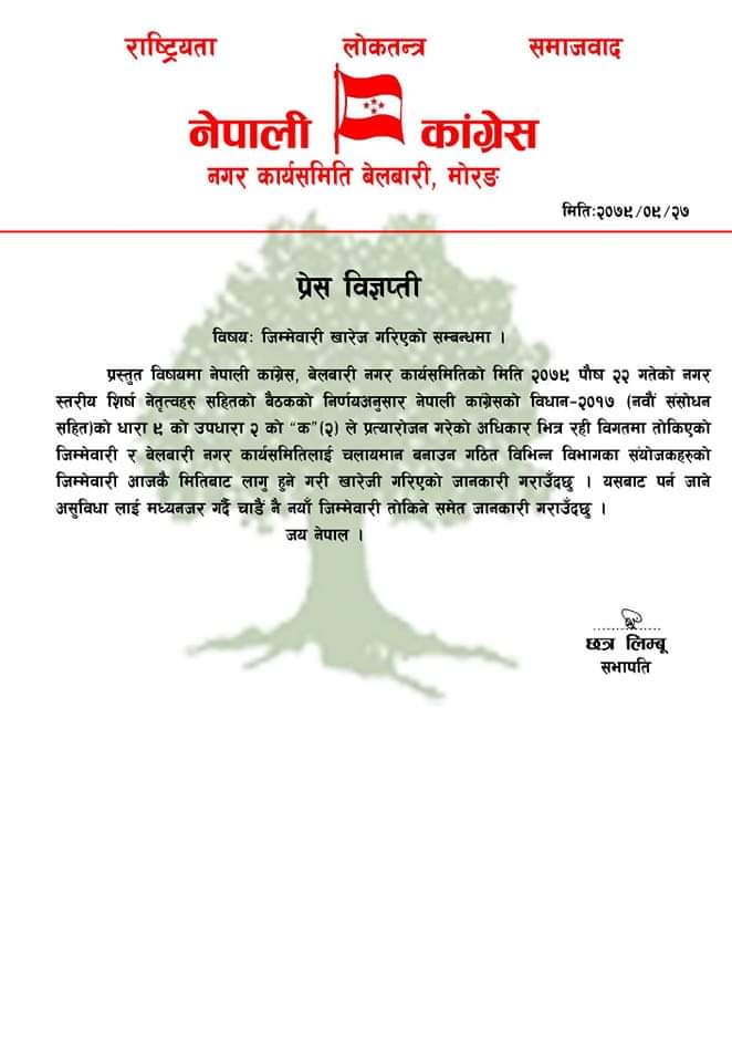 नगर सभापति लिम्बुले जारी गरेको बिज्ञप्ती अनुसार नेपाली काङ्ग्रेसको विधान २०१७ को ९नांै शंषोधन सहतिको धारा ९ को उपधारा २ को क (२) ले प्रत्यारोजन गरेको अधकिार भित्र रहेर कारबाही गरेको उल्लेख छ ।