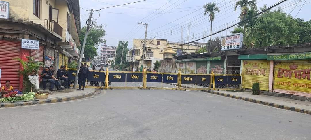 प्रदेश सभा कार्यालय विराटनगरमा सुरक्षा सतर्कता अपनाउदै निषेधज्ञा क्षेत्रमा सुरक्षाको लागी राखिएको प्रहरी ।