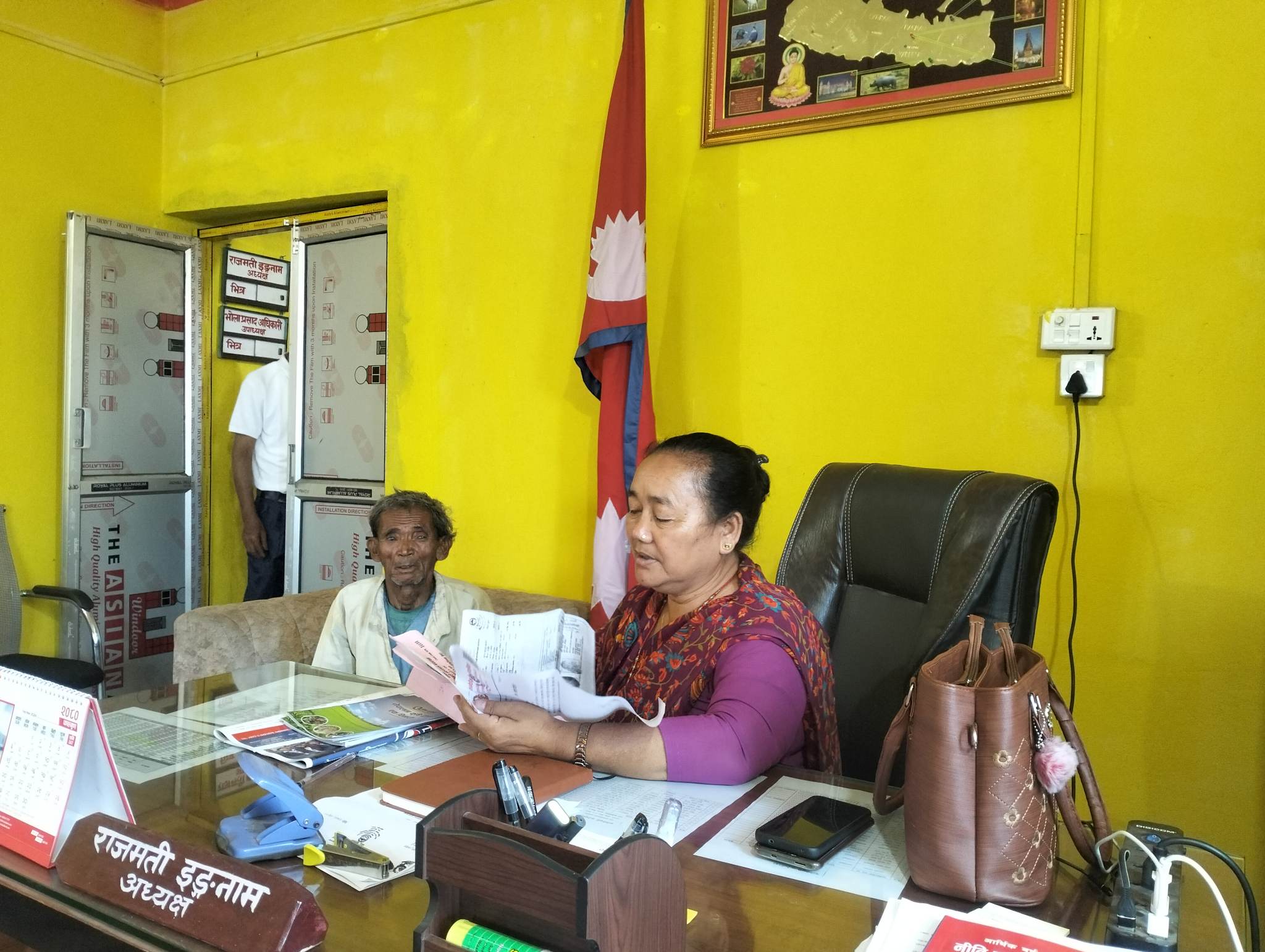 कार्यालयमा सेवा लिन आएका एक वृद्ध सेवाग्राहीको कागजपत्र हेर्दै गाउँ पालिका अध्यक्ष राजमती इङनाम । तस्वीर तिम्मा
