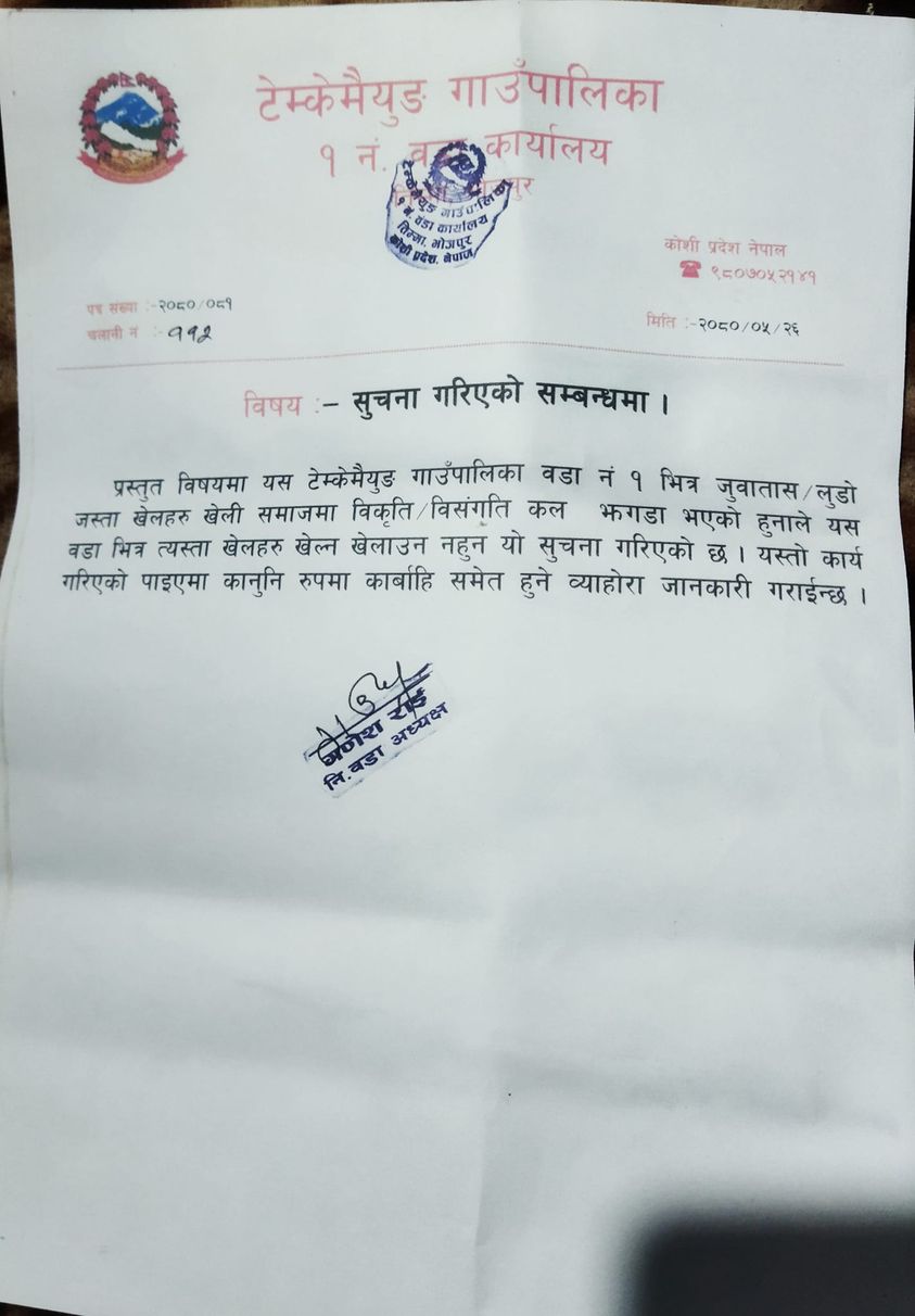 वडा कार्यालयको लेटरप्याडमा कार्यालयको छाप लगाएर यसरी लुडो नखेल्न र नखेलाउन भन्ने सुचना जारी भएको सम्भवत पहिलो हो ।