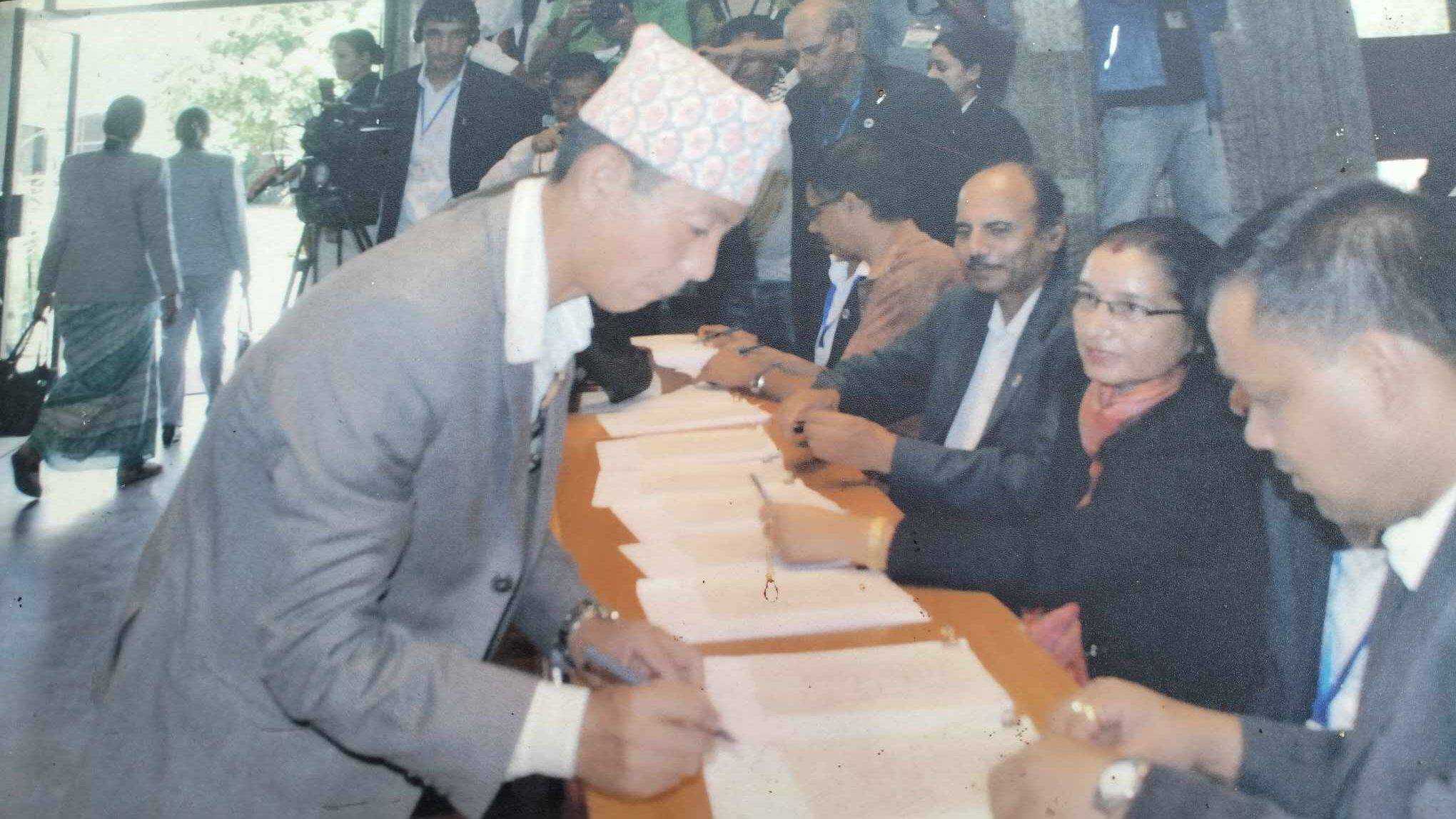 संविधान घोषणा भएपछि २०७२ असोज ३ गते मुल कानुनको पुस्तीकामा हस्ताक्षर गर्दै । तस्वीर स्रोत परिवार