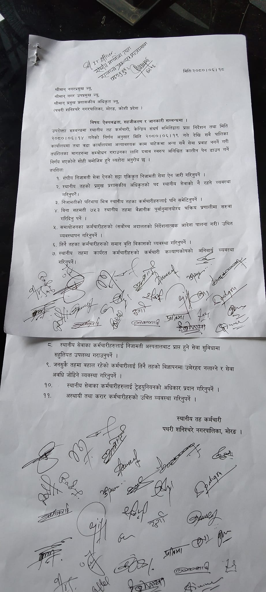 आज शुक्रबार पालिकामा कार्यरत कर्मचारीहरुले सामुहिक रुपमा नगर प्रमुख मोहन तुम्बापो र प्रमुख प्रशासकिय अधिकृत शशी राईलाई ज्ञापनपत्र बुझाउदै पेनडाउन गरी आन्दोलन गरे पश्चात सम्पूर्ण सेवा ठप्प भएको हो ।
