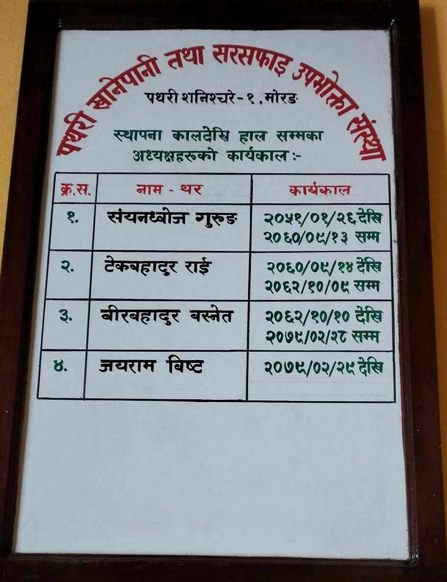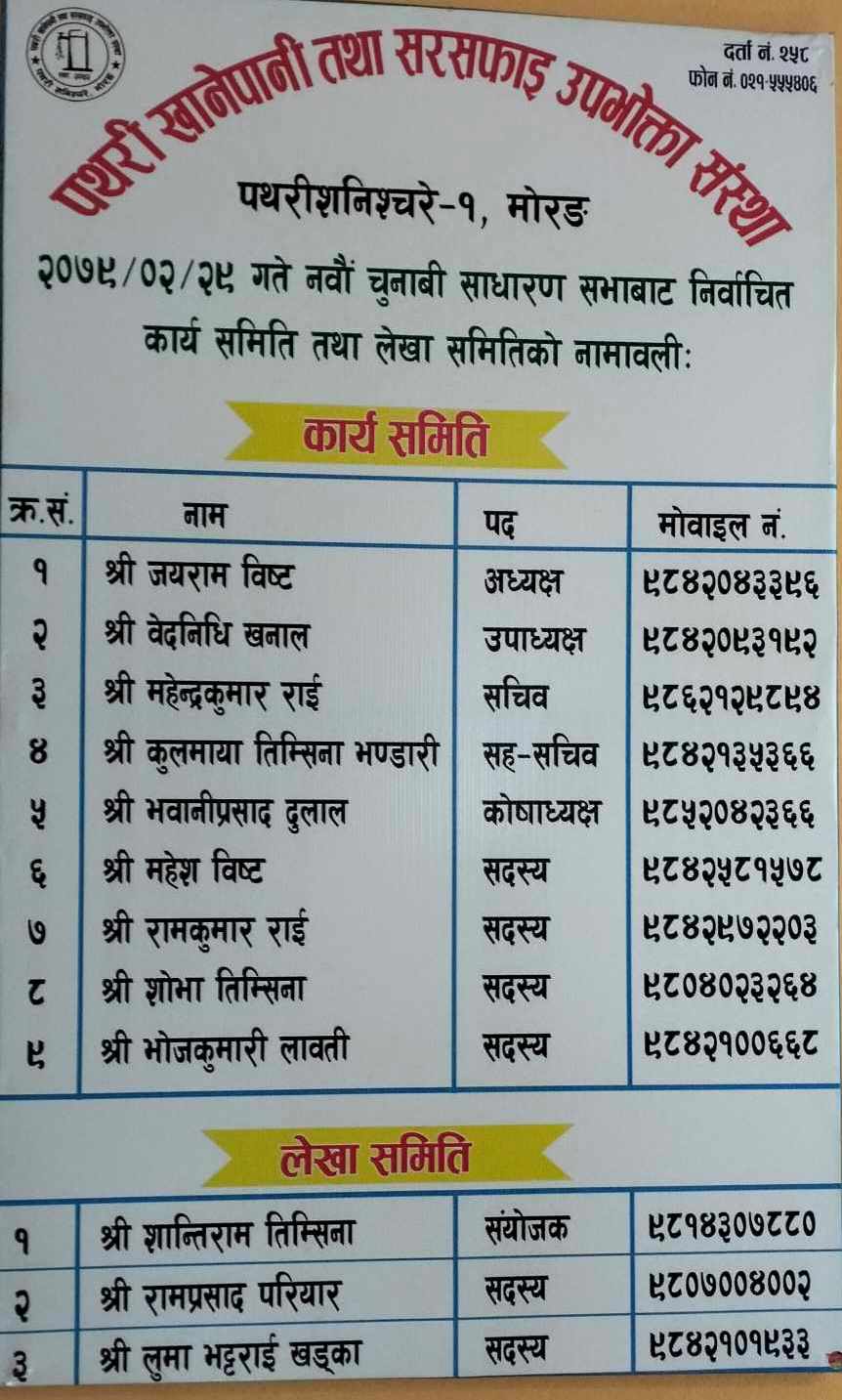 समितिको पदाधिकारी सदस्यहरुको दुरदर्शी योजनाले गर्दा नै यतिबेला पथरी खानेपानी तथा सरसफाई उपभोत्ता समिति दु्रत गतिमा कामलाई अगाडी बढाउन सफल भइरहेको हो ।