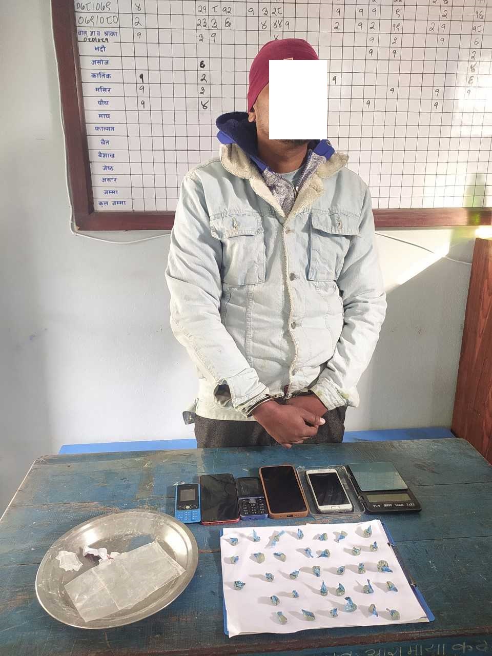 मंगलबार प्रहरी टोलीले गर्दा लागु ब्राउन सुगर सहित निजको साथ बाट बिभिन्न कम्पनीका ५ थान मोबाईल १ थान डिजिटल तराजु सहित पक्राउ गरेको इप्रका पथरीले जनायो ।