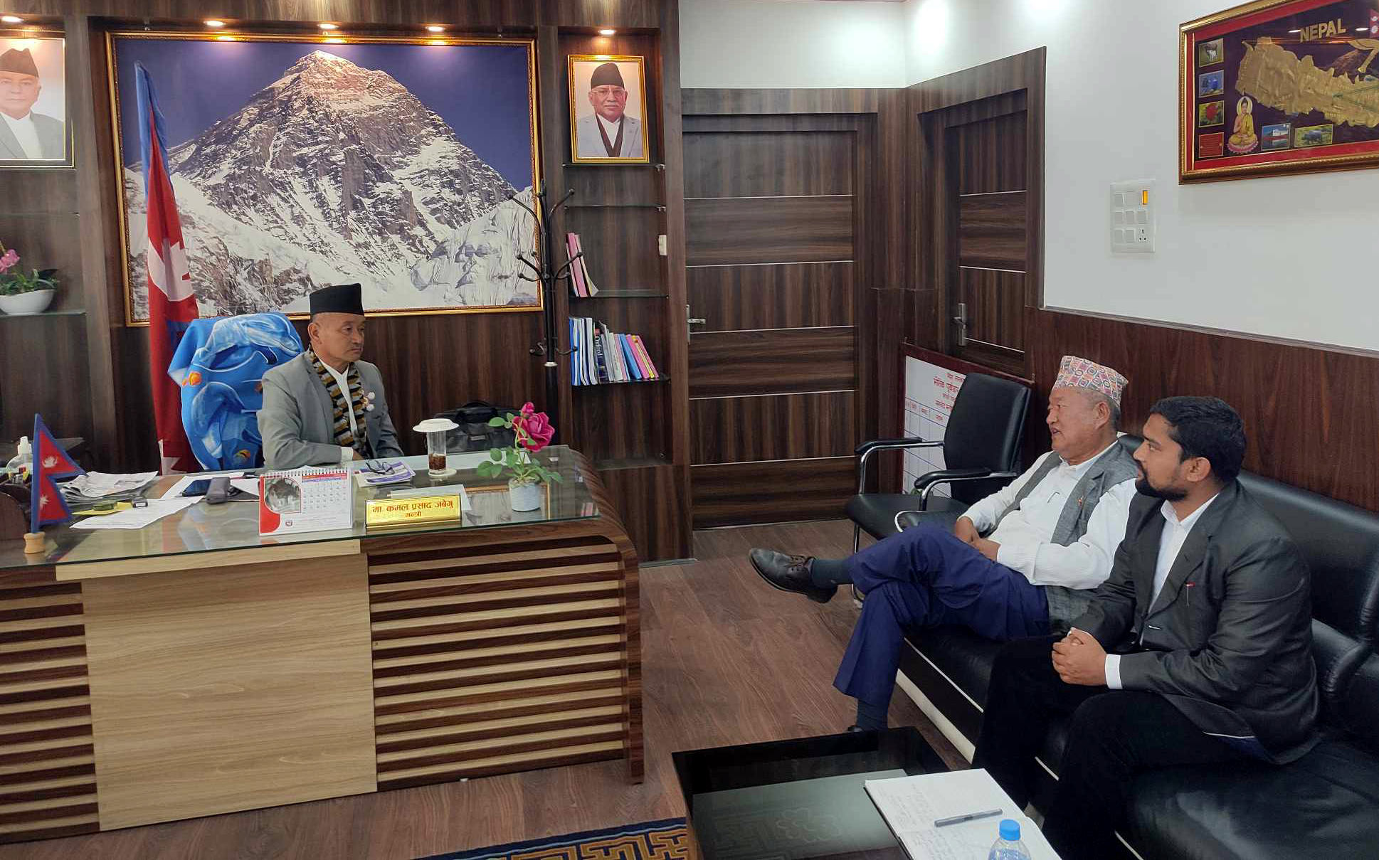 कोशी प्रदेशको भौतिक पूर्वाधारमन्त्री कमल प्रसाद जवेगुको कार्यकक्षमा सडक निर्माणको काम ढिलाई भएको प्रति डेलिगेसन गएका पथरी शनिश्चरे नगर प्रमुख मोहन तुम्बापो र प्रवत्ता नविनजंग कार्की ।
