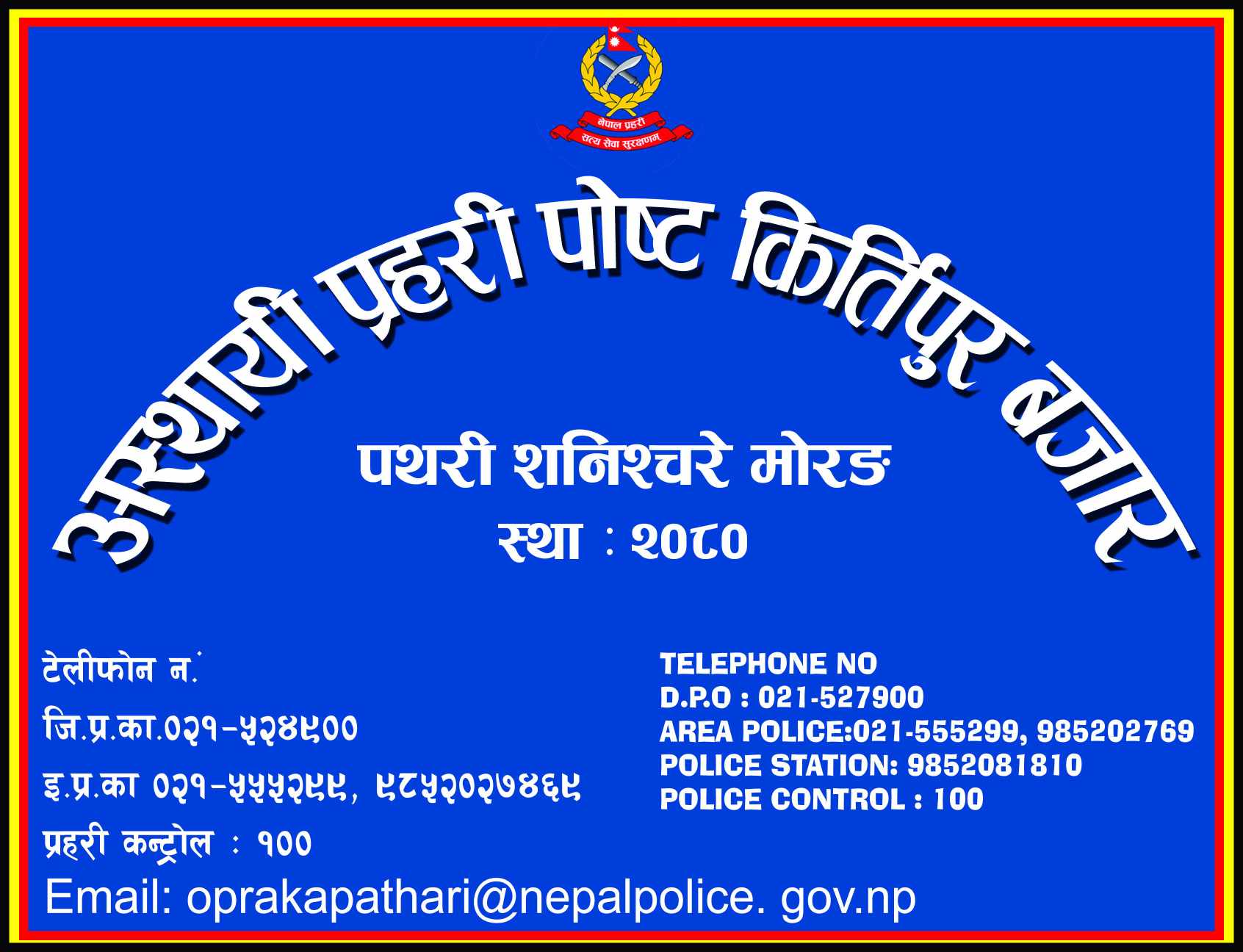हिजो चैत्र २० सोमबार एक कार्यक्रमको विच नगरप्रमुख मोहन तुम्वापो र इलाका प्रहरी कार्यालय पथरीका प्रमुख डिएसपी गणेश बहादुर श्रेष्ठको उपस्थितीमा अस्थाई प्रहरी चौकी किर्तिपुरको भवन निर्माण गर्नको लागि दाताहरुले जग्गा दिने प्रतिवद्धता जनाएका थिए ।