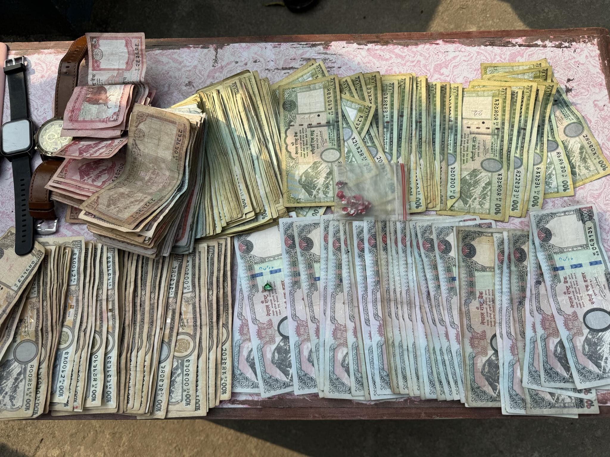 पक्राउ परेका उनिहरुको प्रहरीले नियन्त्रणमा लिएको नगद तथा जिन्सी सामानहरु । तस्वीर इप्रका पथरी