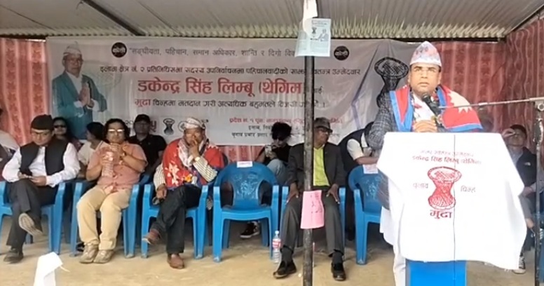 इलाम । स्वतन्त्र साझा उमेद्वार डकेन्द्रसिंह थेगिम लिम्बूलाई सहयोग गर्न इलाम—२ मा लागिरहेका अभियान्ता तथा कानुन व्यवसायी स्वागत नेपालले भ्रष्ट्राचारीलाई मृत्यु दण्ड दिनुपर्ने बताएका छन् । मुढा नुचाव चिन्ह लिएका साझा उमेद्वार डकेन्द्र थेगिम लिम्बू टोलीको आज (बुधबार) इलाम देउमाइ—९ जितपुर बजारमा सभा थियो । सभालाई सम्बोधन गर्दै अभियान्ता स्वागत नेपालले भ्रष्ट्राचार गरेर देश र जनतालाई कंगाल बनाउने बिभिन्न पार्टीका नेताहरुलाई कानुन बनाएर मृत्यु दण्ड दिनुपर्ने बताएका छन् । डकेन्द्रसिंह थेगिमको उमेद्वारी एउटा समुदायको नसोचिकन भ्रष्ट्राचार, अनियमितता विरुद्धको अभियान भएकोले मुढा चिन्हमा भोट दिएर अत्याधिक मतका साथ बिजय गराउन आव्हान गरेका छन् । नयाँ र युवा भनिएकाहरु उमेद्वारहरु आदेशमा चल्ने ‘लाश’ भएको बताए आरोप लगाएका छन् । माहोल हेर्दा डकेन्द्रसिंह थेगिमले जितिसकेको हुनाले क्षेत्री, बाहुन, दलित सम्पूर्ण जनताले भोट दिन स्वागत नेपालले बताए । कार्यक्रममा उमेद्वार डकेन्द्रसिंह थेगिमले अघिल्लो निर्वाचनमा जिताएर पठाएकार व्यक्तिहरुले जनताको काम नगरेर देशलाई कंगाल बनाउने तर्फ बढेको बताए । भ्रष्ट्राचार विरद्ध अभियान चलाउन र उत्पीडित वर्ग समुदायको पक्षमा कानुन बनाउन, प्रत्यक्ष निर्वाचित कार्यकारी प्रमुखके पक्षमा लाग्ने बताए । थेगिमले आफूले जितेर गएपछि ६ वटै प्रदेशको पुन नामकरणको लागि नयाँ अभियानको सुरुवात गर्ने प्रतिबद्धता व्यक्त गरे । कार्यक्रममा पूर्ब संस्कृति मन्त्री गोपाल किराती, खगेन्द्र माखिम, लेखक युग पाठक, बिशेन्द्र पासवान लगायतले सम्बोधन गरेका थिए । कार्यक्रममा गायक कलाकारहरु गंगा फ्याक, तिर्सना नेम्बाङ, सुनिता थेगिम, एकदेश लिम्बू लगायतले सांगीतिक कोशेली प्रस्तुत गरेका थिए । बिभिन्न पार्टीका नेताहरुको भ्रष्ट्राचारी क्रियाकलापको कारण पार्टी र नेताहरुबाट बितृष्णा छाएको कारण स्वतन्त्र उमेद्वार डकेन्द्रसिंह थेगिमको चुनावी सभामा हजारौं समर्थक तथा शुभचिन्तकहरु सहभागी हुने गरेको छ । स्वातन्त्र उमेद्वार थेगिमको चुनावी इलाम बजार, माङ्सेबुङ, माई नगरपालिका लगायतको बिभिन्न स्थानमा हजारौ, उपस्थिति हुने गरेको छ ।