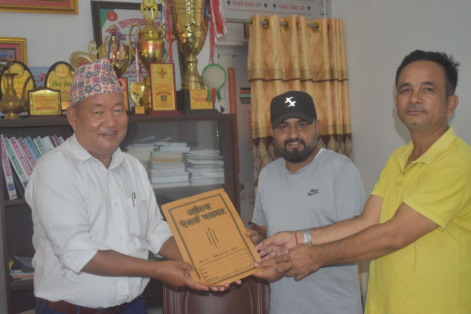 पथरी शनिश्चरे नगर प्रमुख मोहन तुम्बापोलाई ज्ञापनपत्र बुझाउदै शम्भुराज थापा र राजु तिम्सिना ।