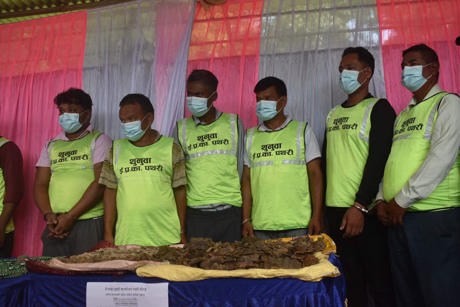आज आयोजित पत्रकार सम्मेलनमा लोपोमुन्ख बन्यजन्तु सालकको हाडखोर र खपटा सहित मानिषहरुलाई समेत सार्वजानिक गरेको थियो । १–०२–०५२ प ११६७ नम्बरको मोटरसाइकलमा सवार रंगेली नगरपालिका वडा न. १ बस्ने वर्ष ४५ को गगन गच्छदार र कन्चनपुर नगरपालिका ५ सप्तरी बस्ने वर्ष ३५ बासुदेव सरदारलाई ८५० ग्राम खपटा सहित पक्राउ गरेर सार्वजानिक गरेको हो ।